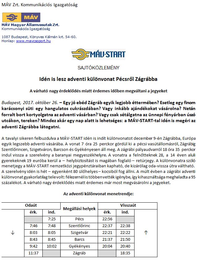 Advent Zágrábban Szerző: Kiss Zoltán Dátum: 2017-10-27 Kategória: Nem kategorizált A különvonatról, az adventi Zágráb látnivalóiról, változatos programjairól bővebben a vasúttársaság honlapján olvashat: https://www.mavcsoport.hu/mav-start/nemzetkozi-utazas/utazzon-velunk-zagrabba-adventi-vasarra-2017-ben. Azok, akik máskor is szívesen utaznának Horvátországba, ezen az oldalunkon tájékozódhatnak a Budapestről Horvátországba közlekedő vonatok menetrendjéről: https://www.mavcsoport.hu/mav-start/nemzetkozi-utazas/horvatorszag. MÁV Magyar Államvasutak Zrt. KOMMUNIKÁCIÓS IGAZGATÓSÁG Telefon: (06-1) 511-3186 l E-mail: sajto@mav.hu l www.mavcsoport.hu Hírekprogram Előző A SZABADSÁG NAPJA Következő Véget ért a Csarnok Kupa Vélemény, hozzászólás? Válasz megszakításaAz e-mail címet nem tesszük közzé. A kötelező mezőket * karakterrel jelöltükHozzászólás * Név * E-mail cím * Honlap A nevem, e-mail címem, és weboldalcímem mentése a böngészőben a következő hozzászólásomhoz.