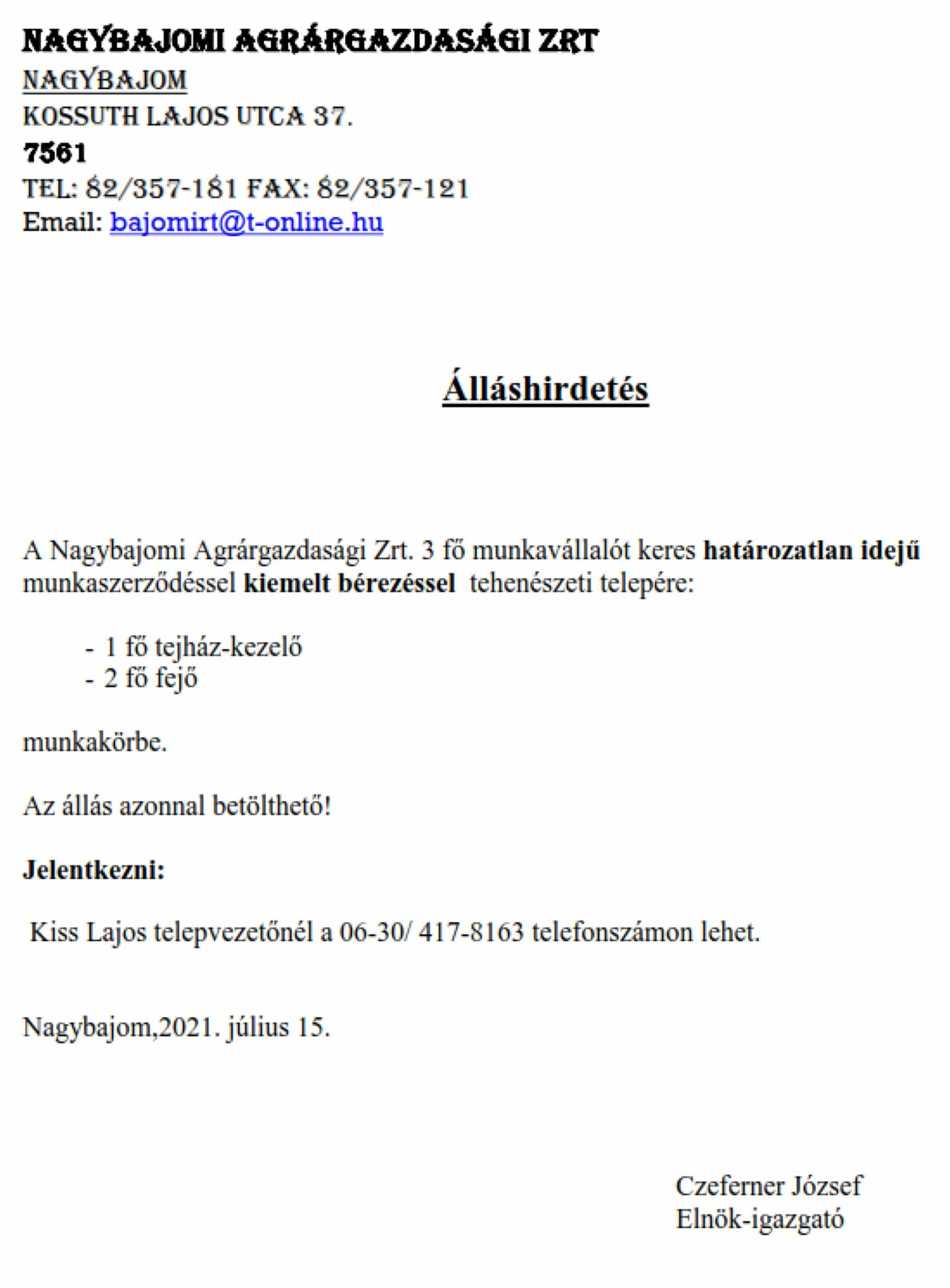 Álláshirdetés Szerző: Kiss Zoltán Dátum: 2021-07-15 Kategória: Hirdetés, Hírek Előző MEGHÍVÓ Következő Anya és leánya Vélemény, hozzászólás? Válasz megszakításaAz e-mail címet nem tesszük közzé. A kötelező mezőket * karakterrel jelöltükHozzászólás * Név * E-mail cím * Honlap A nevem, e-mail címem, és weboldalcímem mentése a böngészőben a következő hozzászólásomhoz.