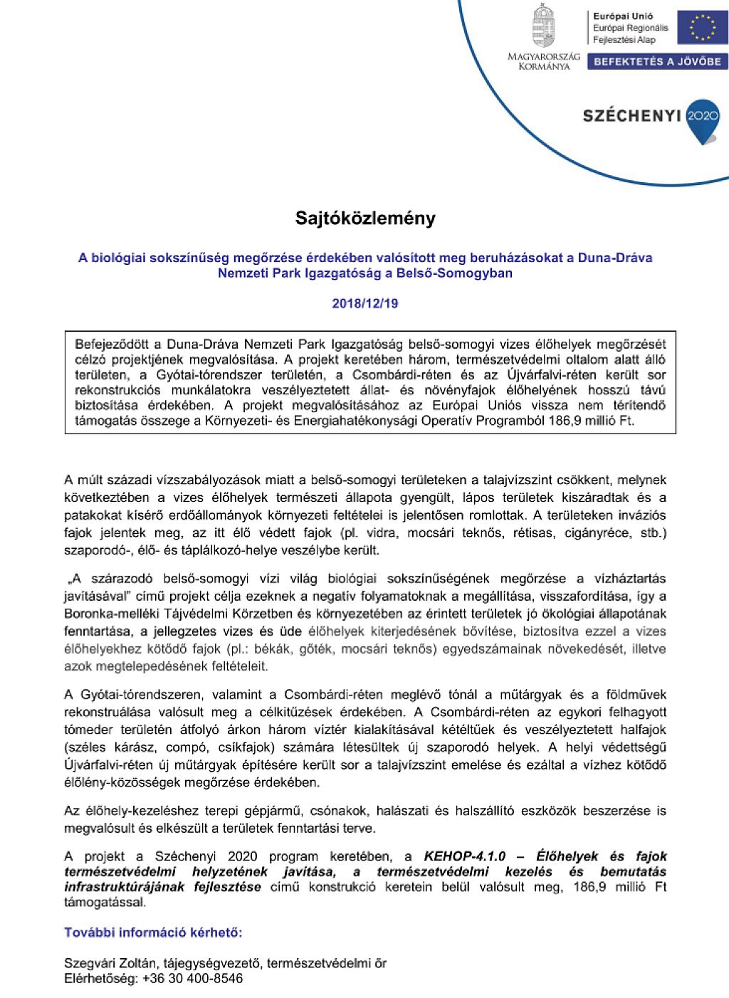 Befejeződött a Duna-Dráva Nemzeti Park Igazgatóság belső-somogyi vizes élőhelyek megőrzését célzó projektjének megvalósítása.