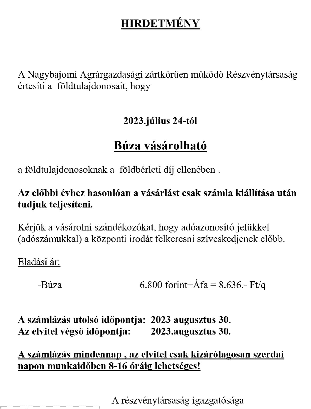 BÚZA ÉRTÉKESÍTÉSE Zrt. tagoknak