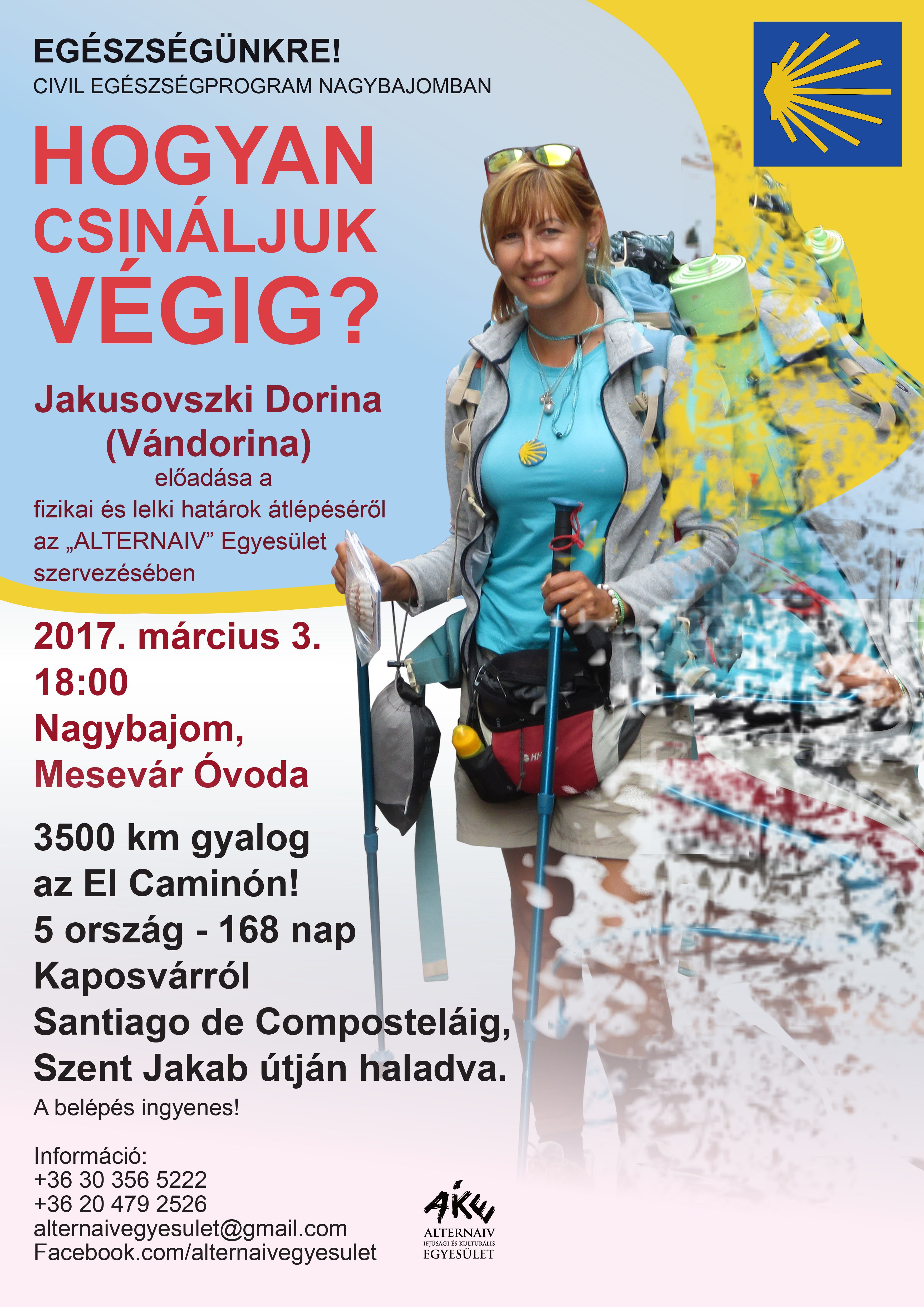 A Hogyan csináljuk végig? című előadás Jakusovszki Dorinával (Vándorina) a lelki és fizikai határok átlépéséről szól, amely az „Egészségünkre! 2017” civil egészségprogram Nagybajomban első rendezvénye. A szervező az „ALTERNAIV” Ifjúsági és Kulturális Egyesület. A kezdeményezésről hamarosan bővebben is írunk.
