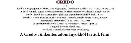 Újrakezdés Fotó – Lukáts Istvánné: Szerkesztői levél – Mentes Mihály: A PAP – Marci Atya: Újrakezdés – Hírek innen-onnan: Ferenc pápa távirata Paskai László halálára Forrás: Vatikán Rádió, fotó: OrientPress, (Magyar Kurír) – Ferenc pápa: Azért táplálkozunk Jézus testével, hogy Jézushoz hasonlóvá váljunk! – Böjte Csaba megoldása a menekültkérdésre sokaknak nem fog tetszeni – Lelkiség: Enzsöl Ellák: Újrakezdés – Szeptember 27. A SZENTÍRÁS VASÁRNAPJA Forrás: Internet – A főangyalok ünnepe: szeptember 29. Forrás: Virtuális Plébánia – Horváth Józsefné Annuska: ÚJRAKEZDÉS – Életünk: Horváth Józsefné Annuska: BÚCSÚZUNK Gerséné Erzsikétől – Fekete Hanna: Ministráns zarándoklat Rómába – Fekete Csaba és Márti: Diakonátus – Anyakönyvi adatok a plébánián – Gyermekeknek: Rejtvény – Veni Sancte – Mese: Iskolás lesz Fülecske – Ministráns zarándoklat Rómába Fotók