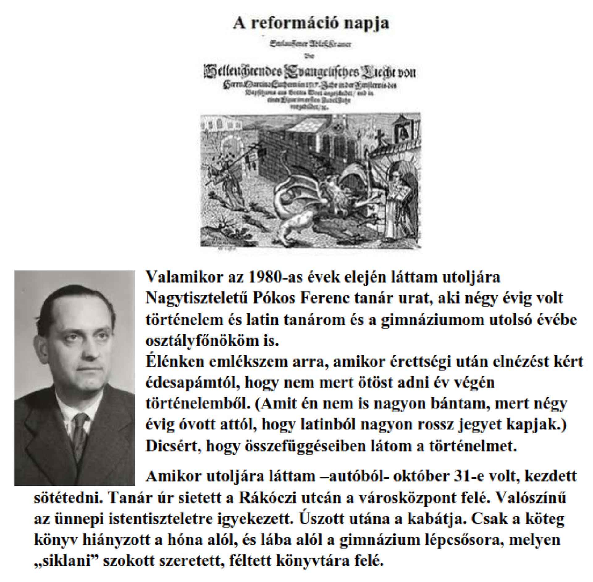 Érettségire készülve történelem tanárom úgy gondolta, hogy az osztály hallgasson szép feleleteket. Felszólította az osztály legjobb tanulóját Kálvin János életéből – az illető egy közeli község református lelkészének gyermeke volt -. „Nem készültem” mondta. A jelenet az év folyamán még kétszer megismétlődött. A harmadik alkalommal a „nem készültem” után származására utalva leült. Vállunk közé húztuk a fejünket. A tanár megdöbbent. Leesett számunkra a tantusz, hogy mért nem akart felelni Kálvin János életéből Ági.