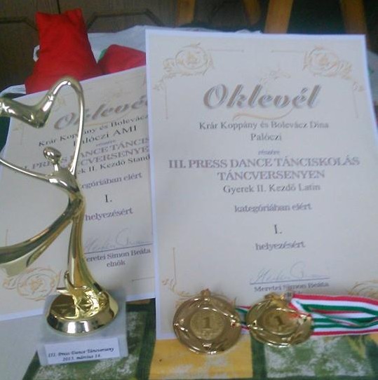 Gyerek II. kezdő standard és latin tánc kategóriában első helyen végzett Krár Koppány – Bolevácz Dina páros.
