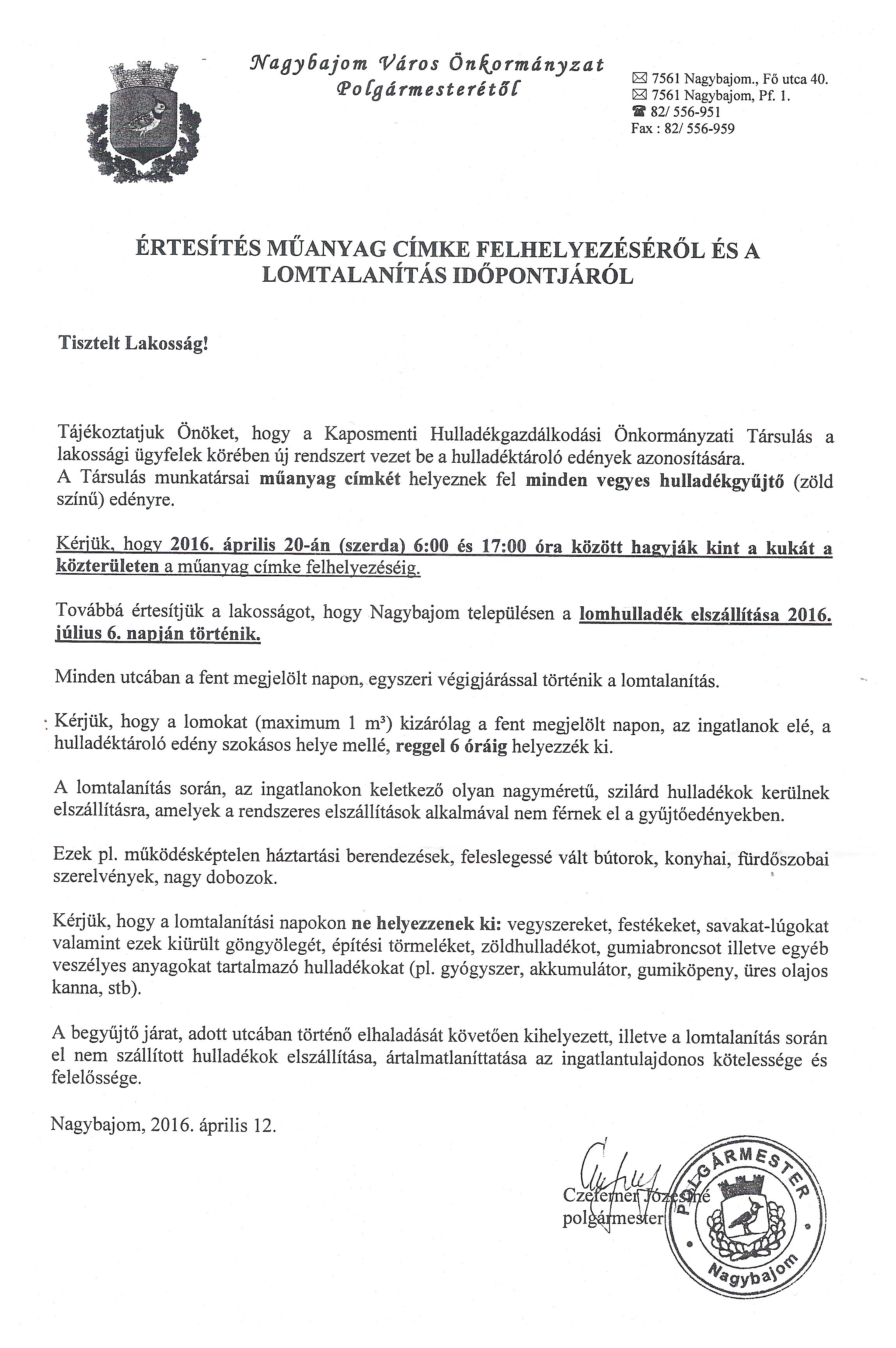 Hulladéktároló edények azonosítása, lomtalanítás Szerző: Kiss Zoltán Dátum: 2016-04-13 Kategória: Nem kategorizált Hírek Előző Röplabdás ezüstérmek Bajáról Következő A Sportcsarnok programjai Vélemény, hozzászólás? Válasz megszakításaAz e-mail címet nem tesszük közzé. A kötelező mezőket * karakterrel jelöltükHozzászólás * Név * E-mail cím * Honlap A nevem, e-mail címem, és weboldalcímem mentése a böngészőben a következő hozzászólásomhoz.