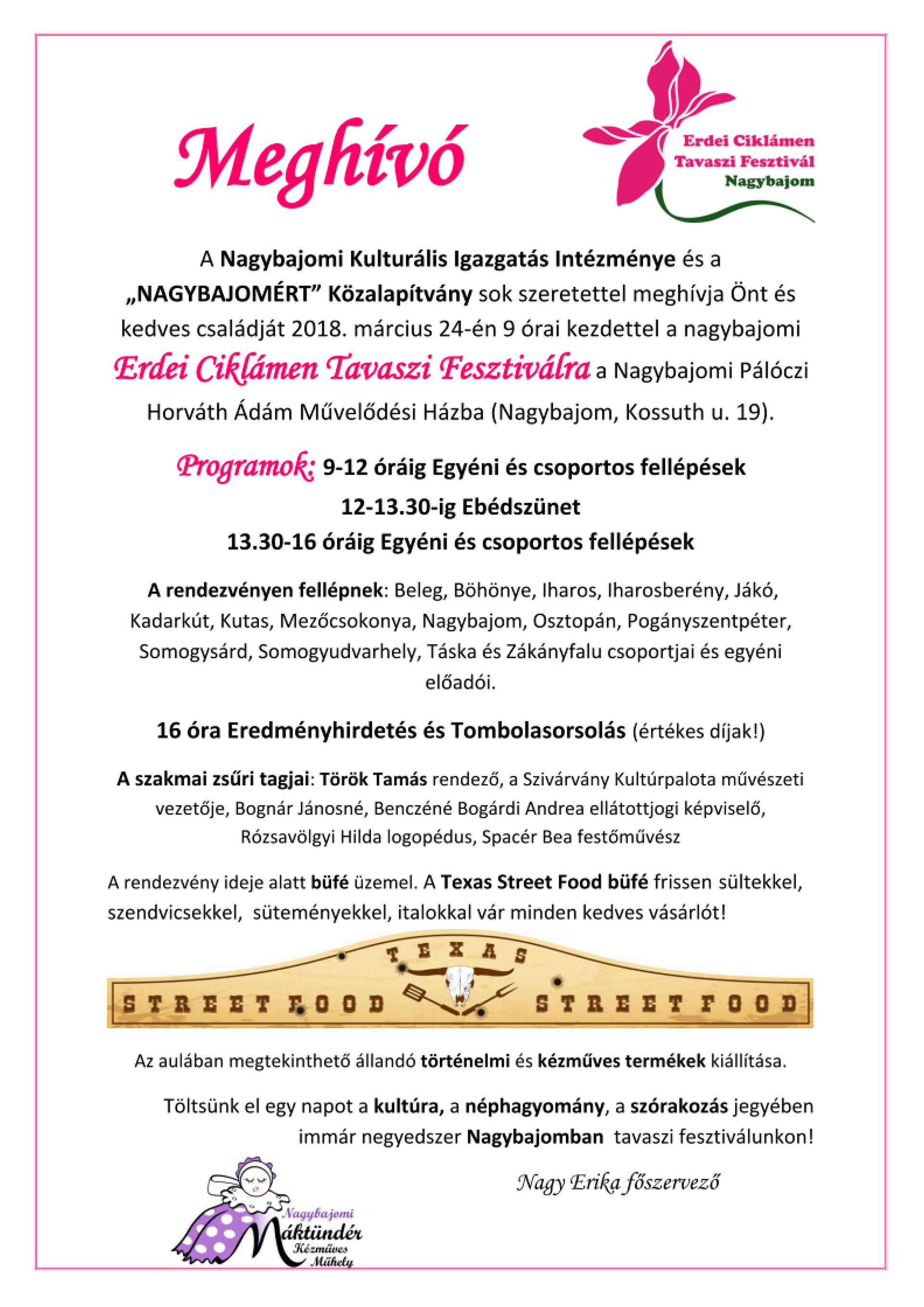 IV. Erdei Ciklámen Tavaszi Fesztivál – Nagybajom Szerző: Kiss Zoltán Dátum: 2018-03-20 Kategória: Hírek NAGYBAJOMfigyelő: 2018. március 20. FELLÉPŐK>>> program Előző EGÉSZSÉGÜNKRE 2018. – fogászati prevenció Következő Lehetséges gázhiány Vélemény, hozzászólás? Válasz megszakításaAz e-mail címet nem tesszük közzé. A kötelező mezőket * karakterrel jelöltükHozzászólás * Név * E-mail cím * Honlap A nevem, e-mail címem, és weboldalcímem mentése a böngészőben a következő hozzászólásomhoz.