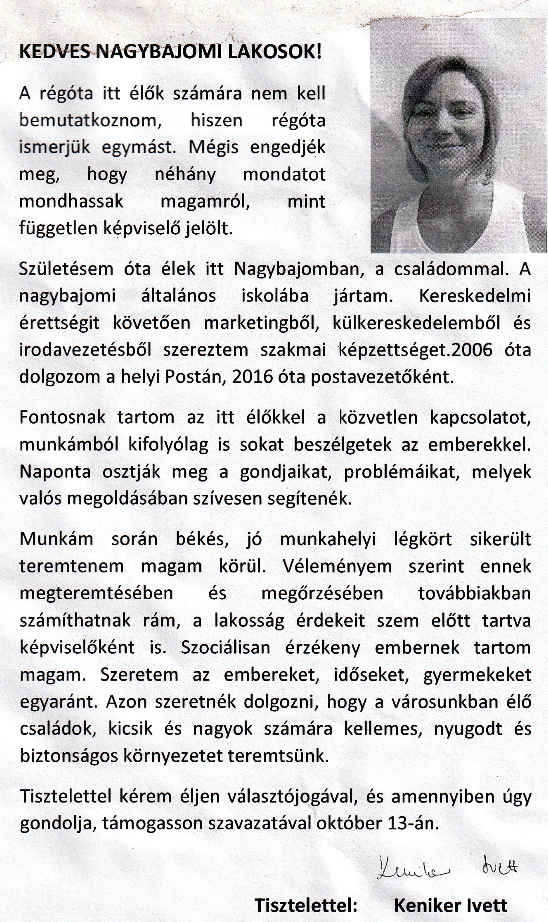 Képviselőjelölt: Keniker Ivett Szerző: Kiss Zoltán Dátum: 2019-10-10 Kategória: Nem kategorizált Hírekválasztás2019 Előző HUS-TI BT Műfüves bajnokság Nagybajom 2019. – 10. forduló Következő Önkormányzati választások 2019. Nagybajom – eredmények Vélemény, hozzászólás? Válasz megszakításaAz e-mail címet nem tesszük közzé. A kötelező mezőket * karakterrel jelöltükHozzászólás * Név * E-mail cím * Honlap A nevem, e-mail címem, és weboldalcímem mentése a böngészőben a következő hozzászólásomhoz.