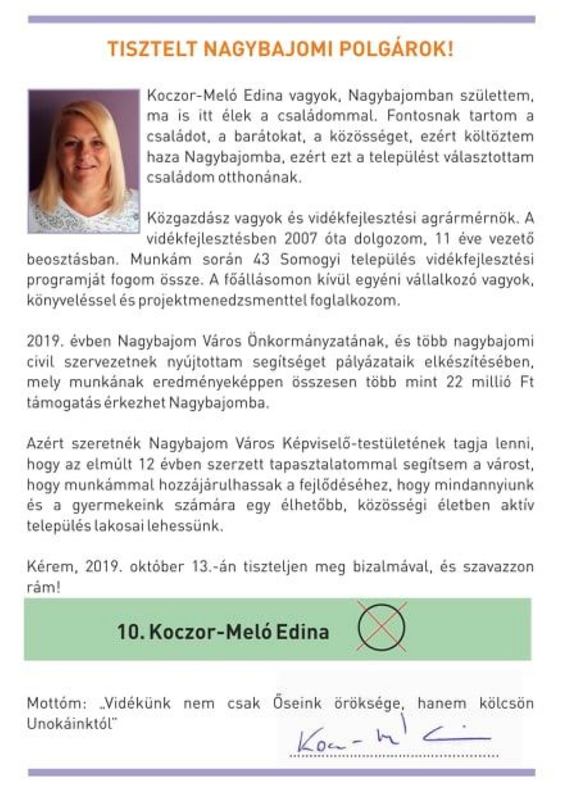 Képviselőjelölt: Koczor-Meló Edina Szerző: Kiss Zoltán Dátum: 2019-10-03 Kategória: Nem kategorizált Forrás: szórólap Az ÖNKORMÁNYZATI HIVATAL HÍREI<<< Hírekválasztás2019 Előző Képviselőjelölt: Németh Ernő Következő HUS-TI BT Műfüves bajnokság Nagybajom 2019. – 9. forduló Vélemény, hozzászólás? Válasz megszakításaAz e-mail címet nem tesszük közzé. A kötelező mezőket * karakterrel jelöltükHozzászólás * Név * E-mail cím * Honlap A nevem, e-mail címem, és weboldalcímem mentése a böngészőben a következő hozzászólásomhoz.