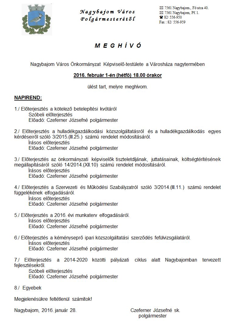 Képviselőtestületi ülés Szerző: Kiss Zoltán Dátum: 2016-01-28 Kategória: Nem kategorizált Előző Csarnok kupa teremlabdarúgó bajnokság 2015 – 2016. – 8. forduló Nagybajom Következő MEGHÍVÓ Vélemény, hozzászólás? Válasz megszakításaAz e-mail címet nem tesszük közzé. A kötelező mezőket * karakterrel jelöltükHozzászólás * Név * E-mail cím * Honlap A nevem, e-mail címem, és weboldalcímem mentése a böngészőben a következő hozzászólásomhoz.