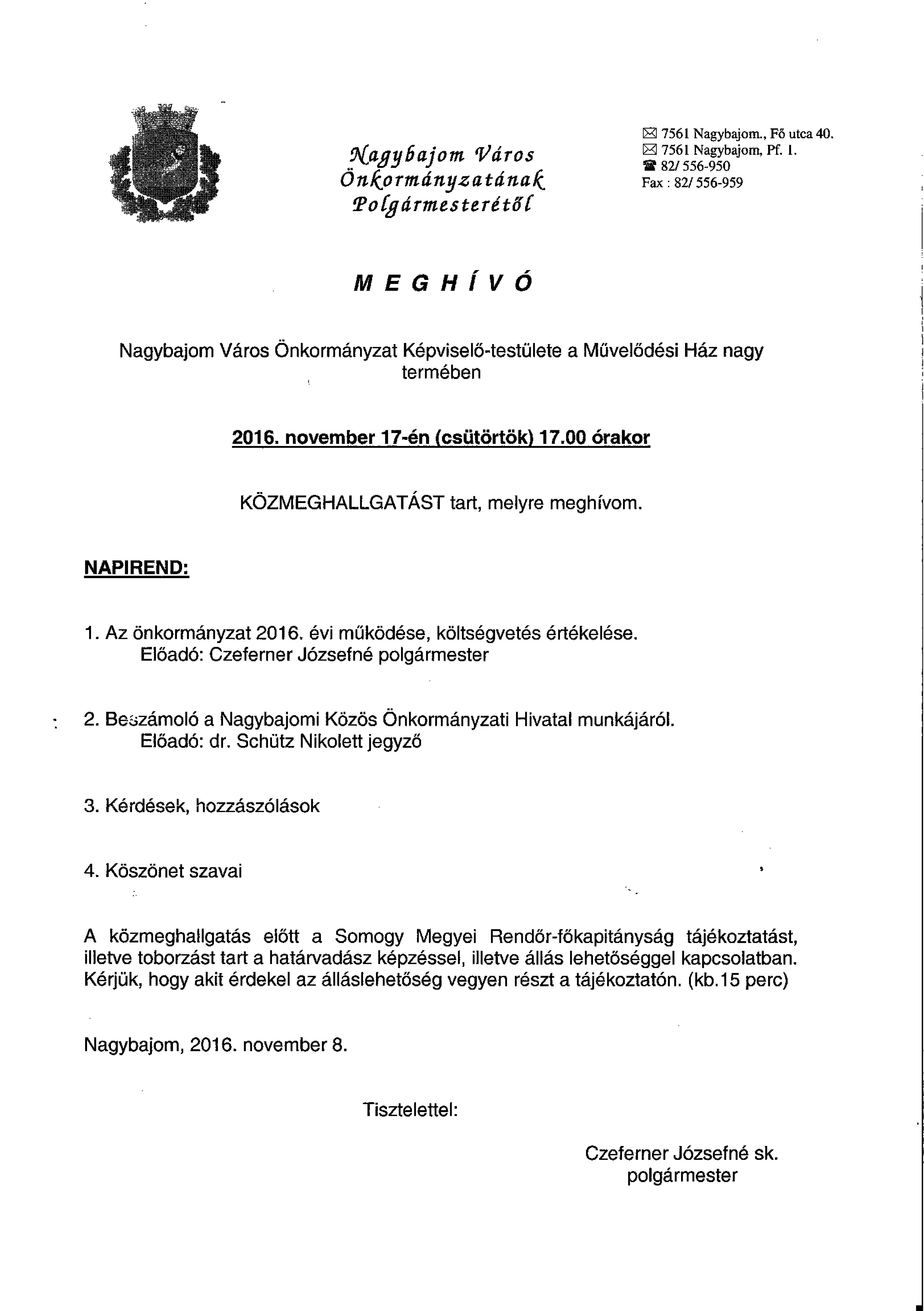 Közmeghallgatás Szerző: Kiss Zoltán Dátum: 2016-11-11 Kategória: Nem kategorizált Hírek Előző NAPTÁR – 2016. noveber, Nagybajom Következő Szelektív hulladék gyűjtése Vélemény, hozzászólás? Válasz megszakításaAz e-mail címet nem tesszük közzé. A kötelező mezőket * karakterrel jelöltükHozzászólás * Név * E-mail cím * Honlap A nevem, e-mail címem, és weboldalcímem mentése a böngészőben a következő hozzászólásomhoz.
