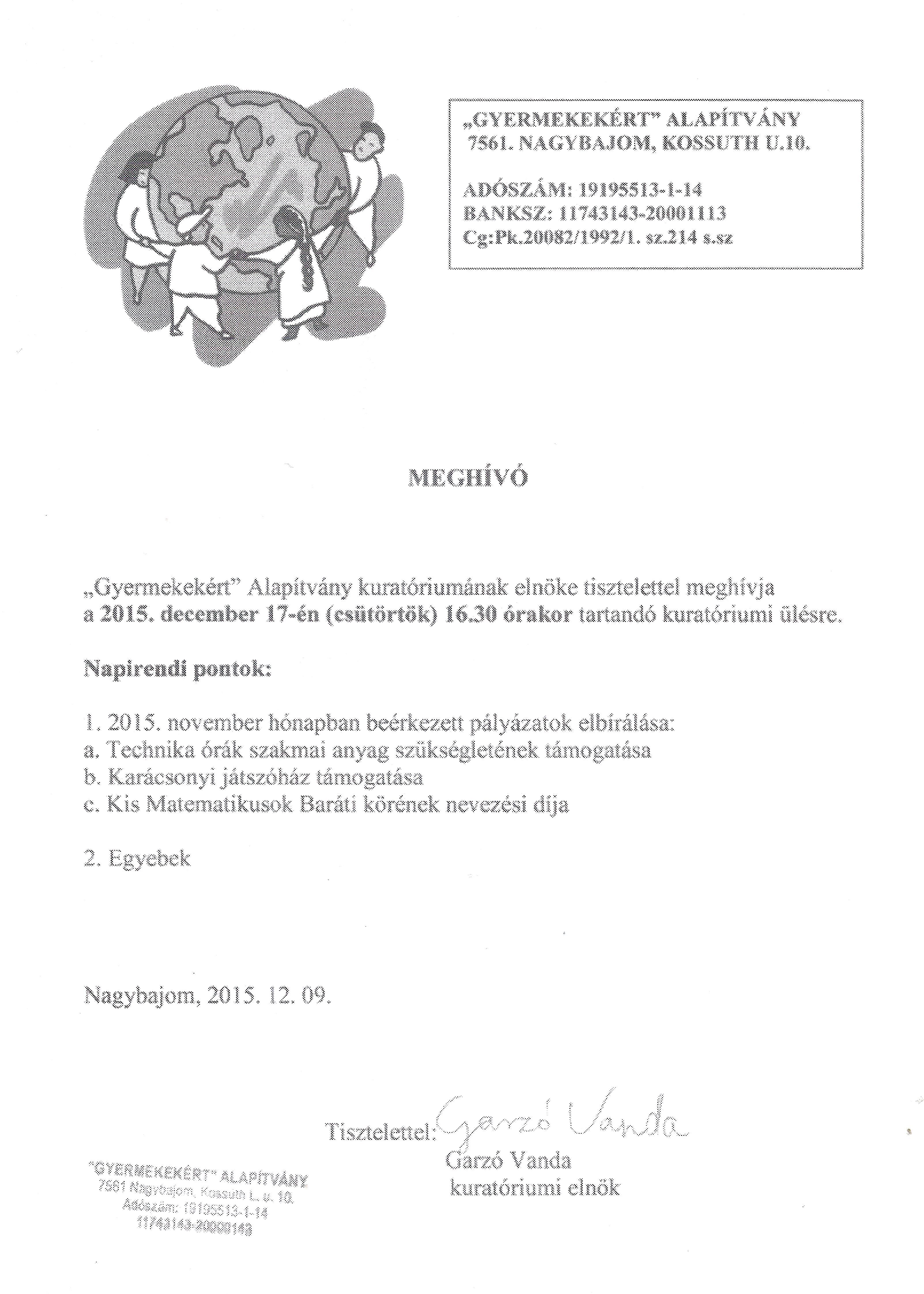 Kuratóriumi meghívó – Gyermekekért alapítvány Szerző: Kiss Zoltán Dátum: 2015-12-11 Kategória: Nem kategorizált Hírek Előző Amatőr teremlabdarúgó bajnokság 2015 – 2016. – 3.forduló Következő Budapestről 2 arany és egy ezüst érmet hoztunk Vélemény, hozzászólás? Válasz megszakításaAz e-mail címet nem tesszük közzé. A kötelező mezőket * karakterrel jelöltükHozzászólás * Név * E-mail cím * Honlap A nevem, e-mail címem, és weboldalcímem mentése a böngészőben a következő hozzászólásomhoz.