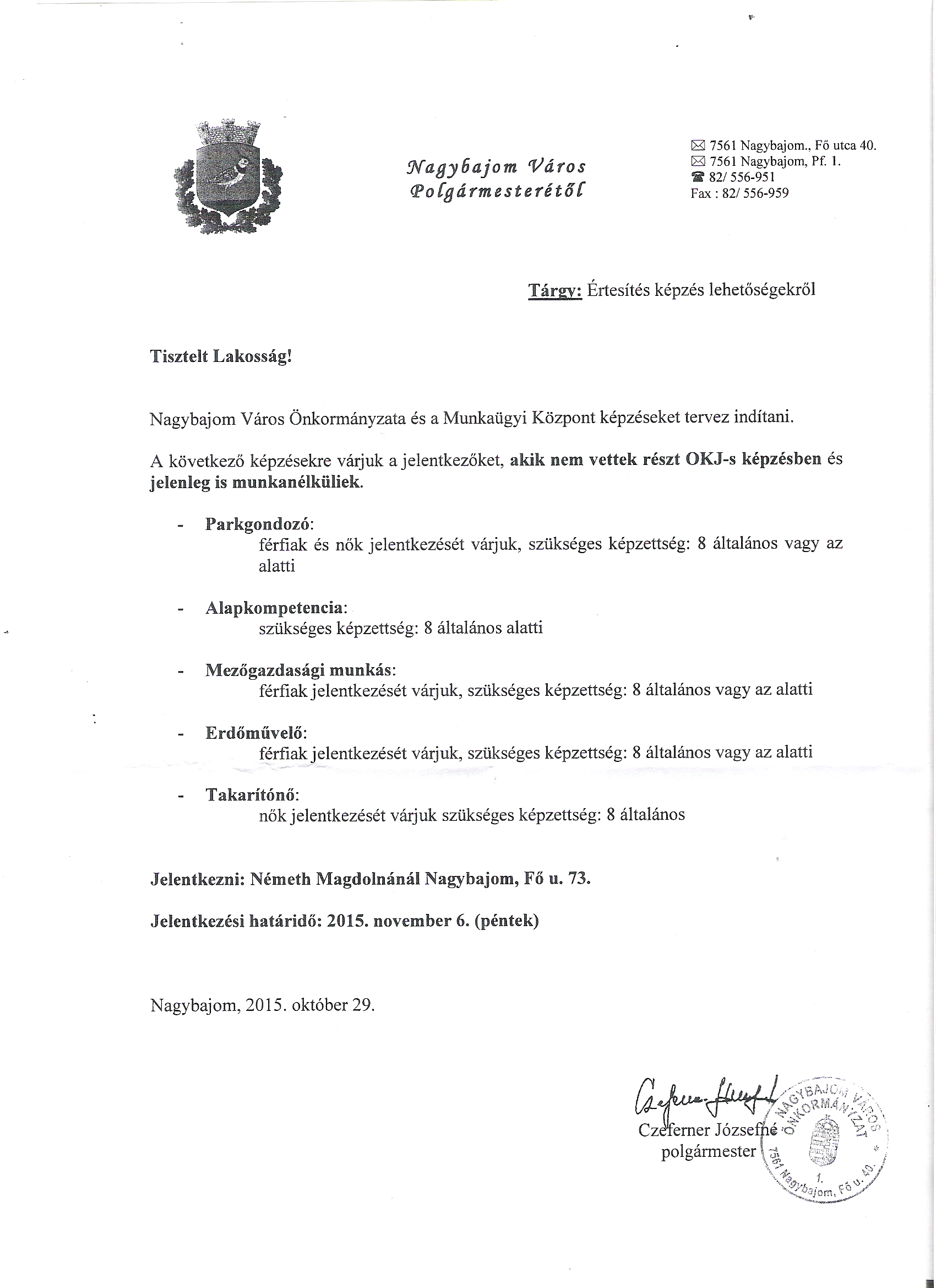 Jelentkezés: Németh Magdolna Nagybajom, Fő u. 73.