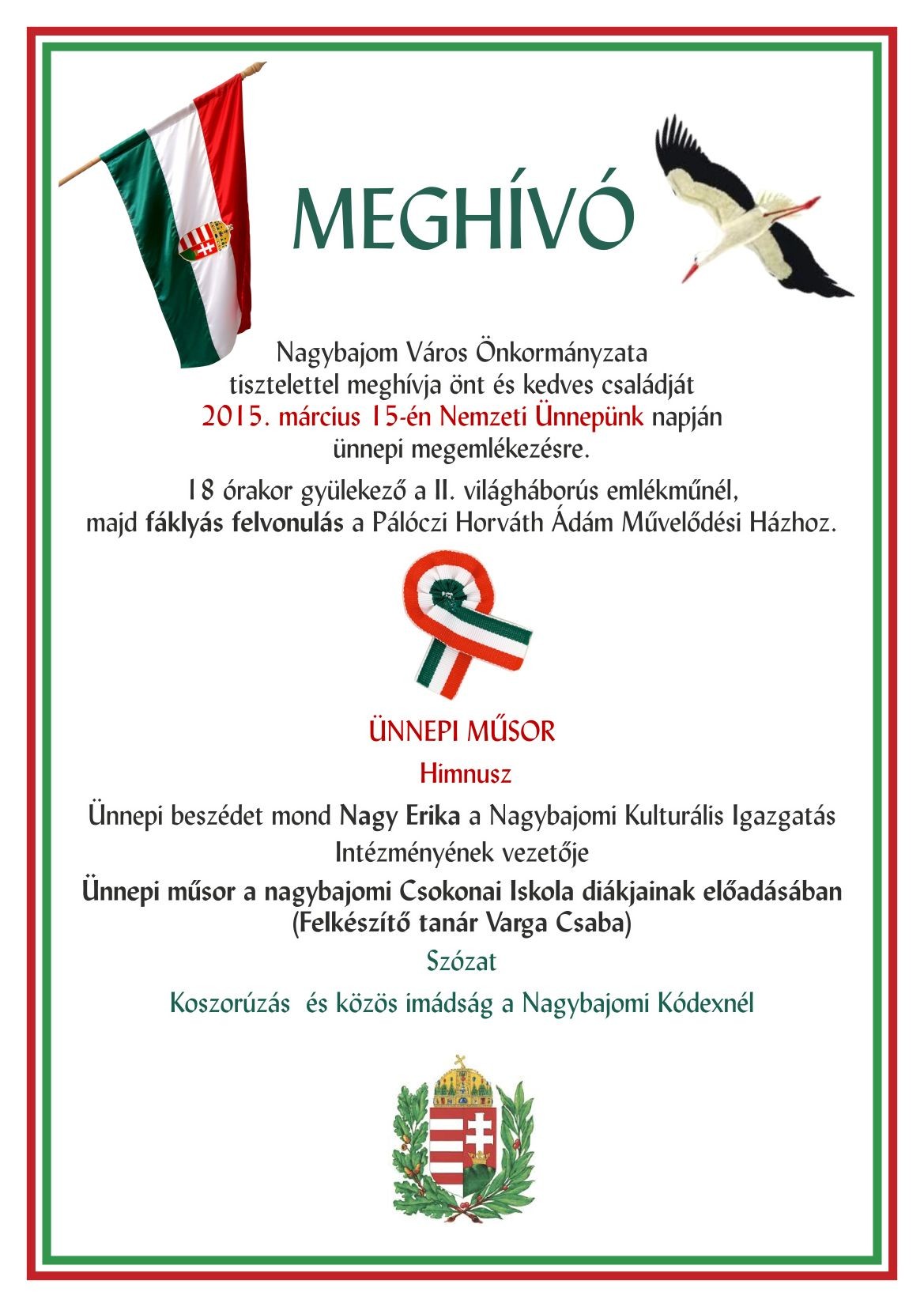 15-én 18 órakor kezdődik a fáklyás felvonulás,a II. világháborús emlékműtől. Ünnepi beszédet Nagy Erika mond, ünnepi műsort az általános iskola ad.