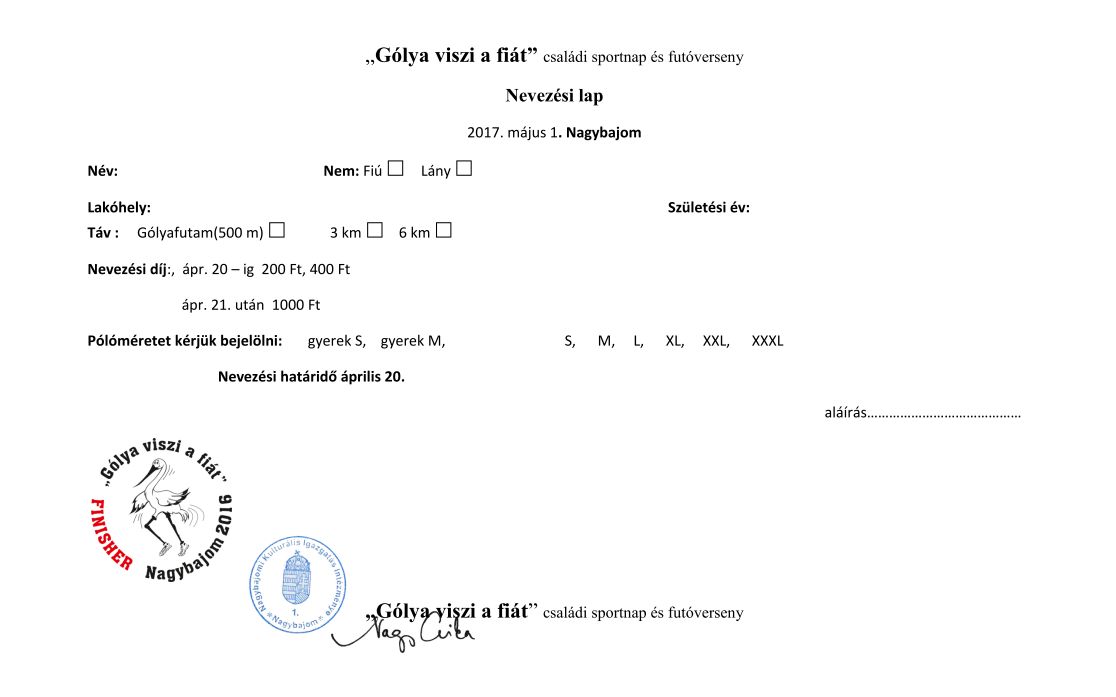 A Nagybajomi Kulturális Igazgatás Intézménye 2017. május 1-én „Gólya viszi a fiát” címmel családi sportnapot szervez A rendezvény futóversenyének Nevezési lapja letölthető innen>>>