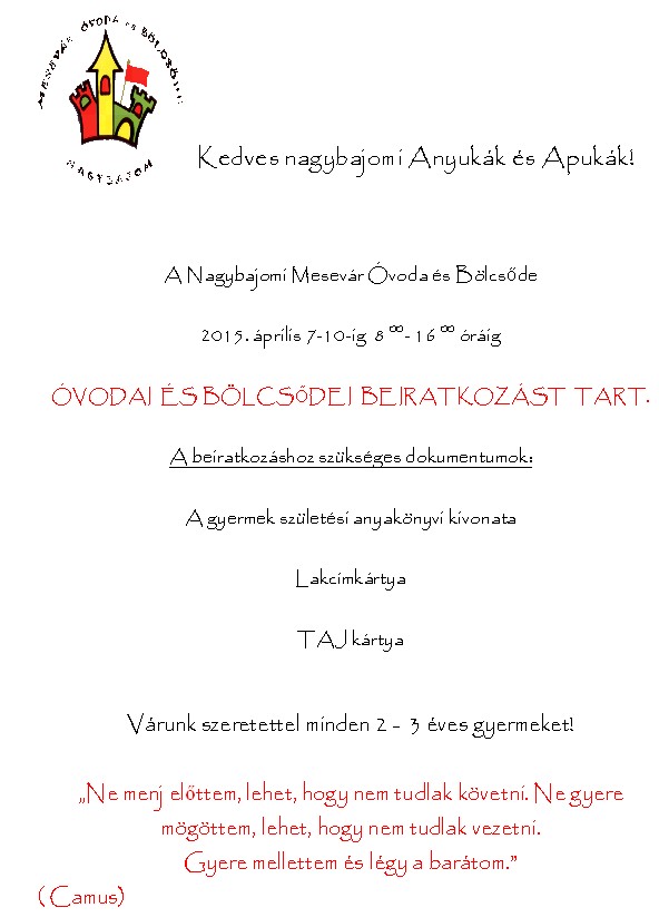 Óvodai és bölcsődei beíratás Szerző: Kiss Zoltán Dátum: 2015-03-30 Kategória: Nem kategorizált Hírek Előző Arany Székesfehérvárról is Következő NAPTÁR – április – Nagybajom Vélemény, hozzászólás? Válasz megszakításaAz e-mail címet nem tesszük közzé. A kötelező mezőket * karakterrel jelöltükHozzászólás * Név * E-mail cím * Honlap A nevem, e-mail címem, és weboldalcímem mentése a böngészőben a következő hozzászólásomhoz.