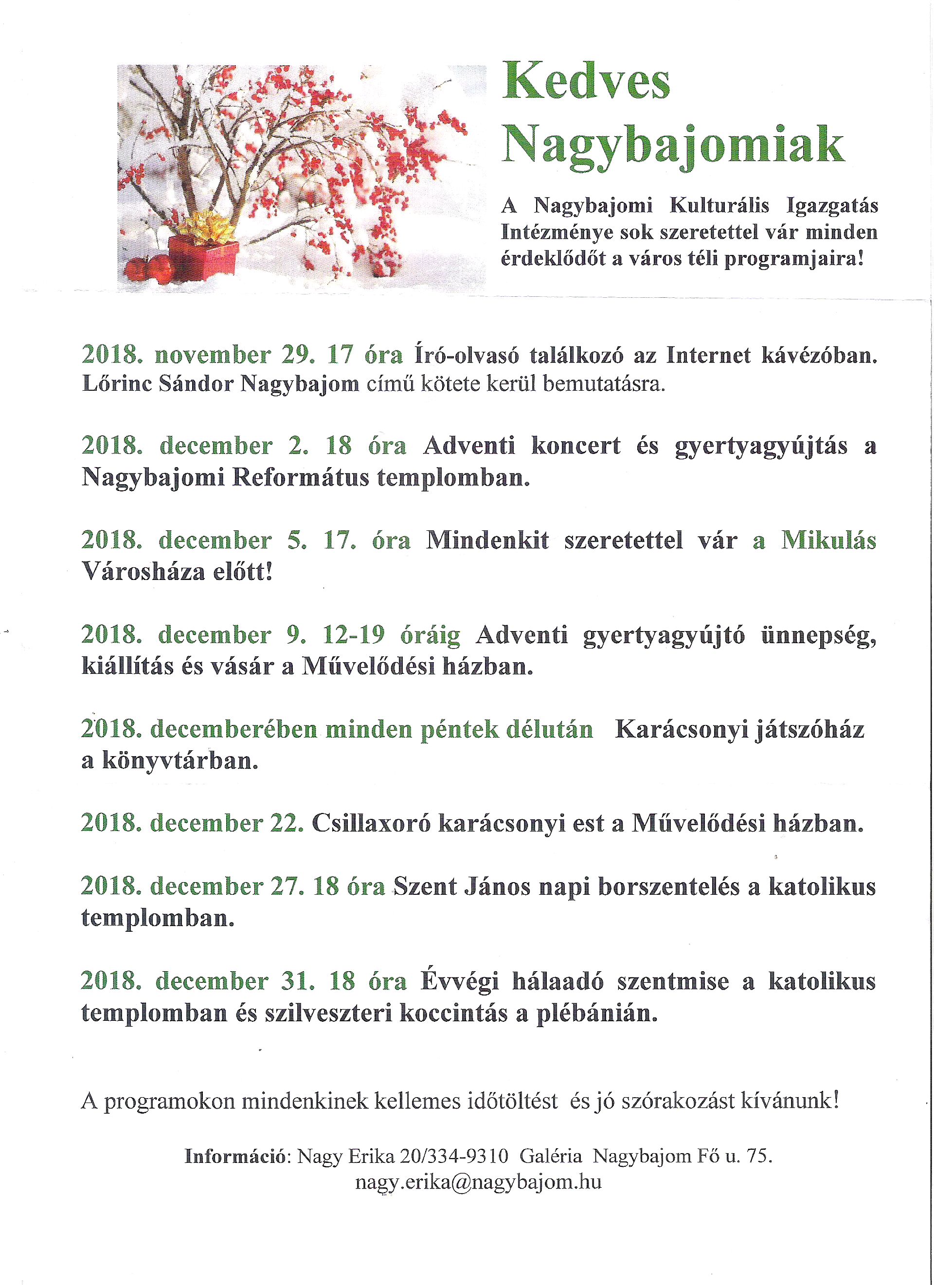 Program – 2018. november – december Szerző: Kiss Zoltán Dátum: 2018-11-27 Kategória: Nem kategorizált NAGYBAJOMfigyelő: 2018. november 27. HírekNAPTÁRprogram Előző JÖN A MIKULÁS Következő Legyél te is ösztöndíjas diák! Vélemény, hozzászólás? Válasz megszakításaAz e-mail címet nem tesszük közzé. A kötelező mezőket * karakterrel jelöltükHozzászólás * Név * E-mail cím * Honlap A nevem, e-mail címem, és weboldalcímem mentése a böngészőben a következő hozzászólásomhoz.