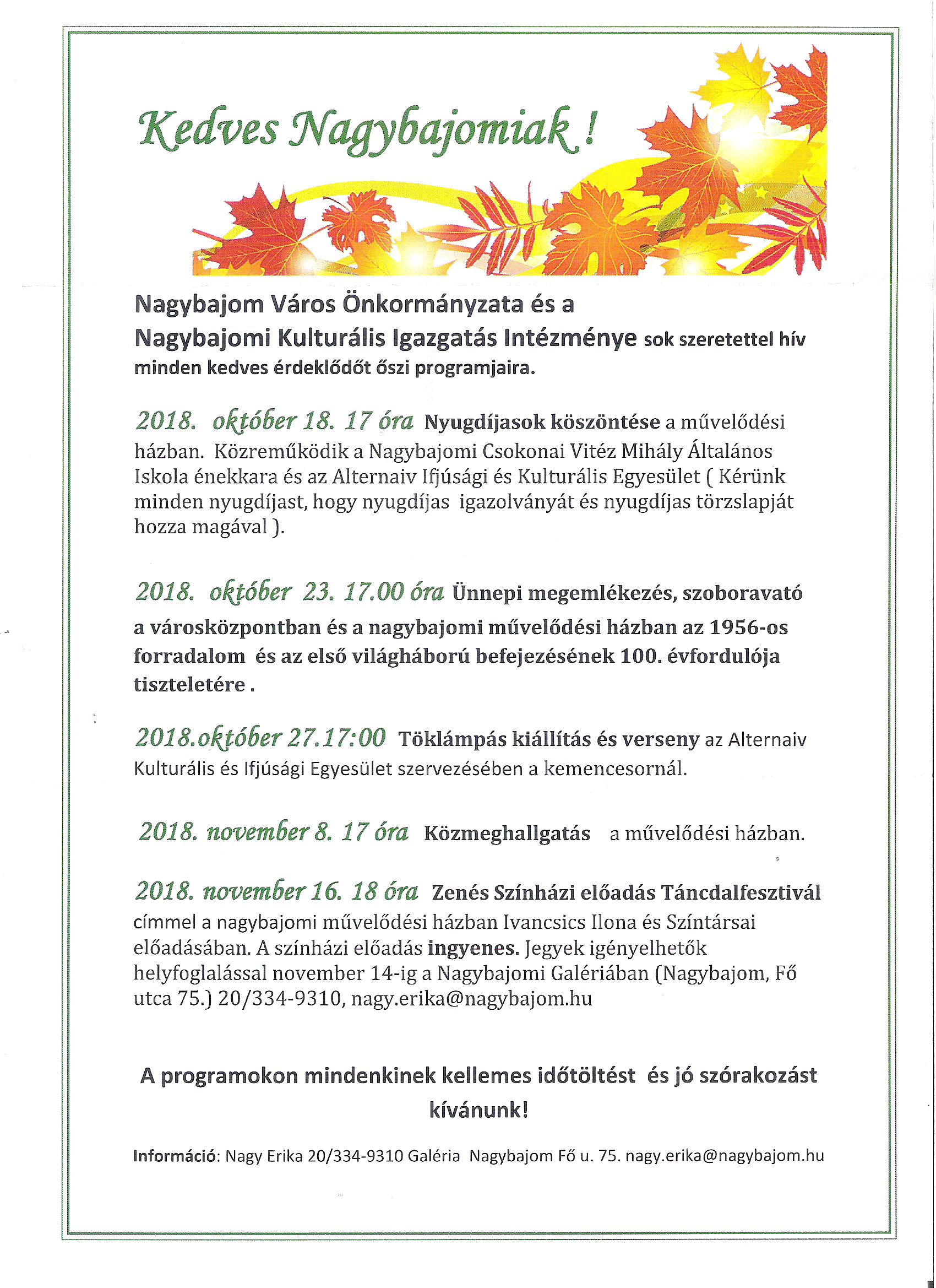 Program – 2018. október – november Szerző: Kiss Zoltán Dátum: 2018-10-12 Kategória: Nem kategorizált NAGYBAJOMfigyelő 2018. október 12. nagy.erika@nagybajom.hu HírekNAPTÁRprogram Előző MEGHÍVÓ – színházi előadás Következő EURÓPA PÉK KFT. NAGYBAJOM műfüves bajnokság 2018. – 14. forduló Vélemény, hozzászólás? Válasz megszakításaAz e-mail címet nem tesszük közzé. A kötelező mezőket * karakterrel jelöltükHozzászólás * Név * E-mail cím * Honlap A nevem, e-mail címem, és weboldalcímem mentése a böngészőben a következő hozzászólásomhoz.