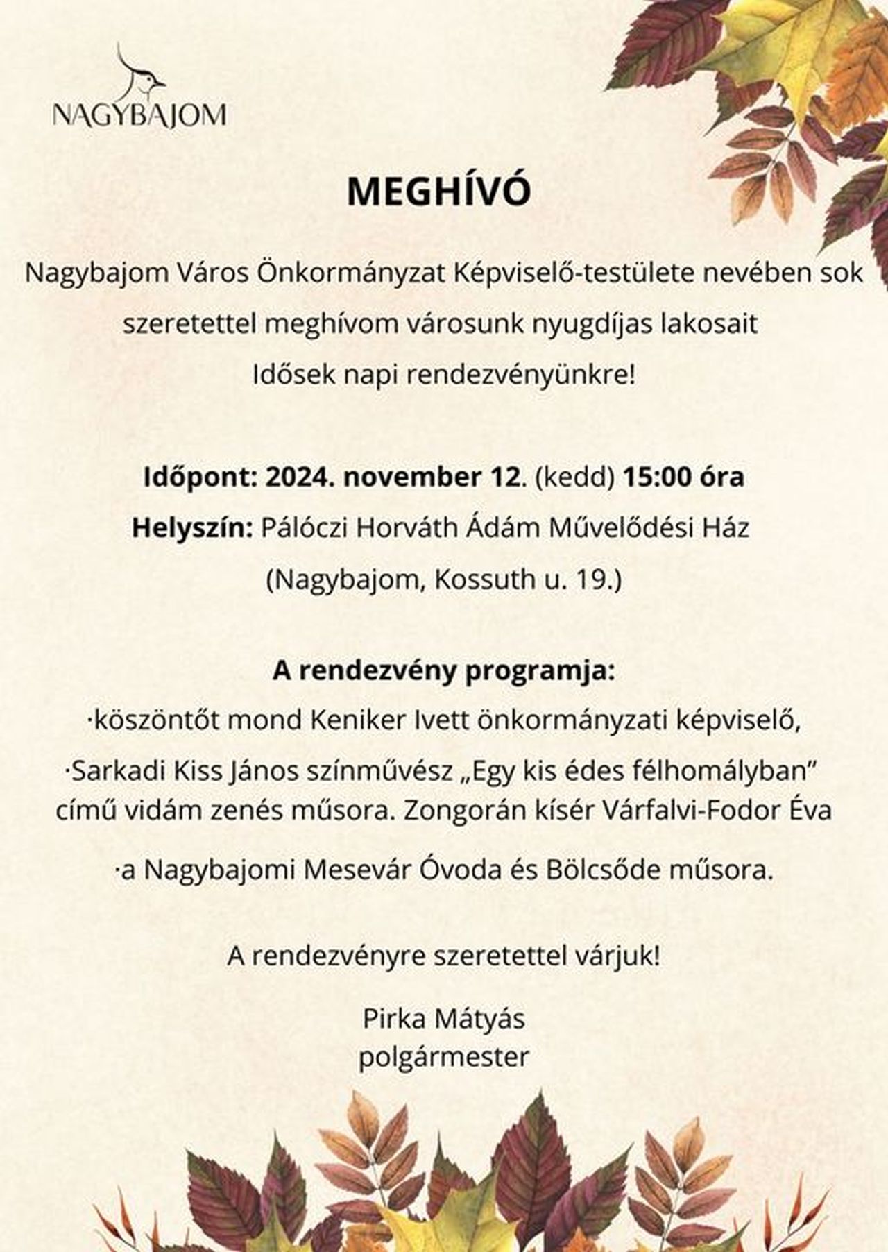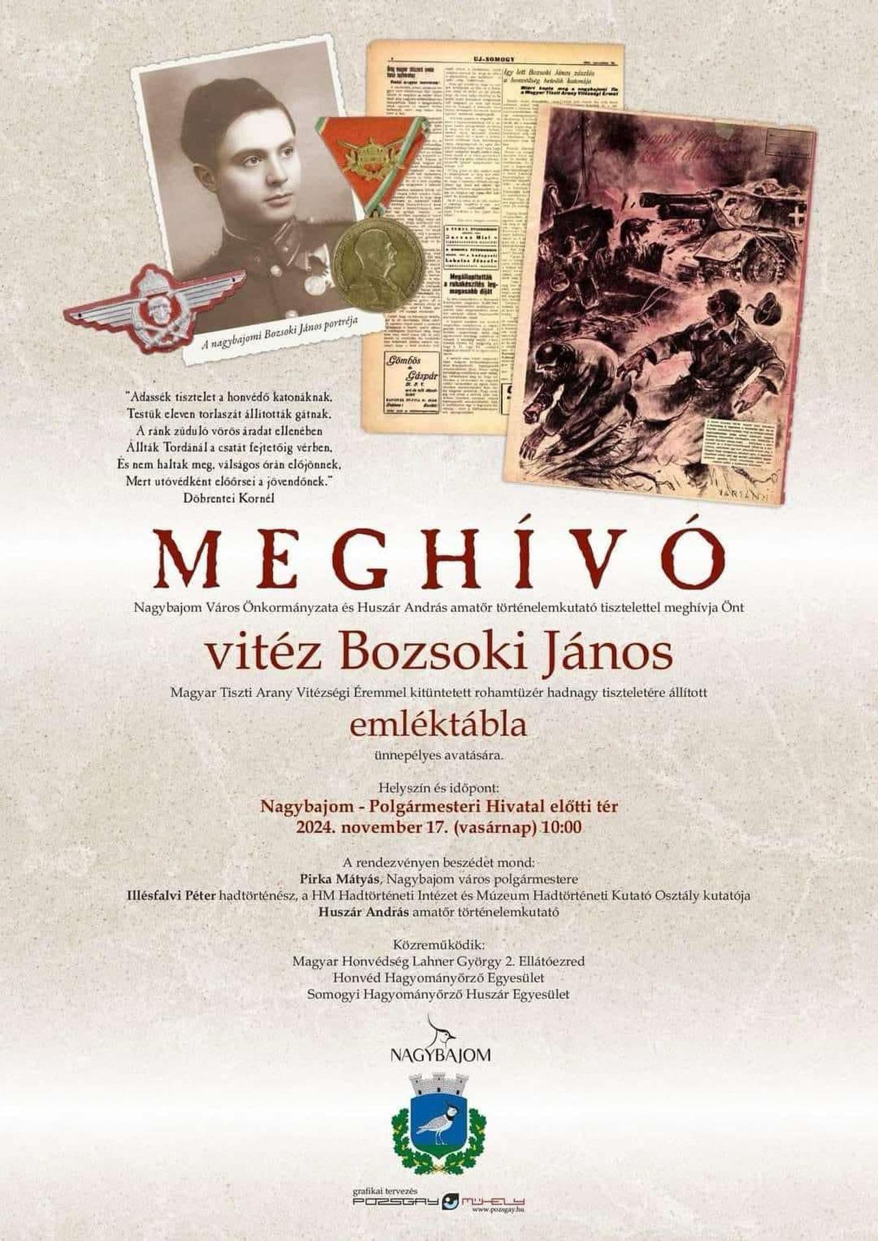 Nagy tisztelettel hívunk minden kedves nagybajomit a vitéz Bozsoki János, Magyar Tiszti Arany Vitézségi Éremmel kitüntetett rohamtüzér hadnagy, Nagybajom Város Díszpolgára tiszteletére állított emléktábla ünnepélyes felavatására, amelyre jövő vasárnap 10:00 órakor kerül sor Nagybajomban a főtéren a városháza előtt!