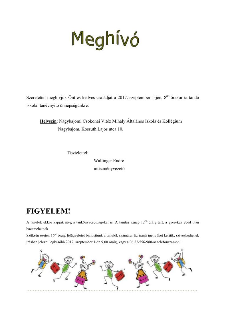 TANÉVNYITÓ Szerző: Kiss Zoltán Dátum: 2017-08-22 Kategória: Nem kategorizált HA NAGYÍTANI KÍVÁNJA, KATTINTSON A MEGHÍVÓRA VAGY IDE>>> Hírek Előző NAPTÁR – 2017. augusztus Következő Kicsik a nagyok ünnepén Vélemény, hozzászólás? Válasz megszakításaAz e-mail címet nem tesszük közzé. A kötelező mezőket * karakterrel jelöltükHozzászólás * Név * E-mail cím * Honlap A nevem, e-mail címem, és weboldalcímem mentése a böngészőben a következő hozzászólásomhoz.