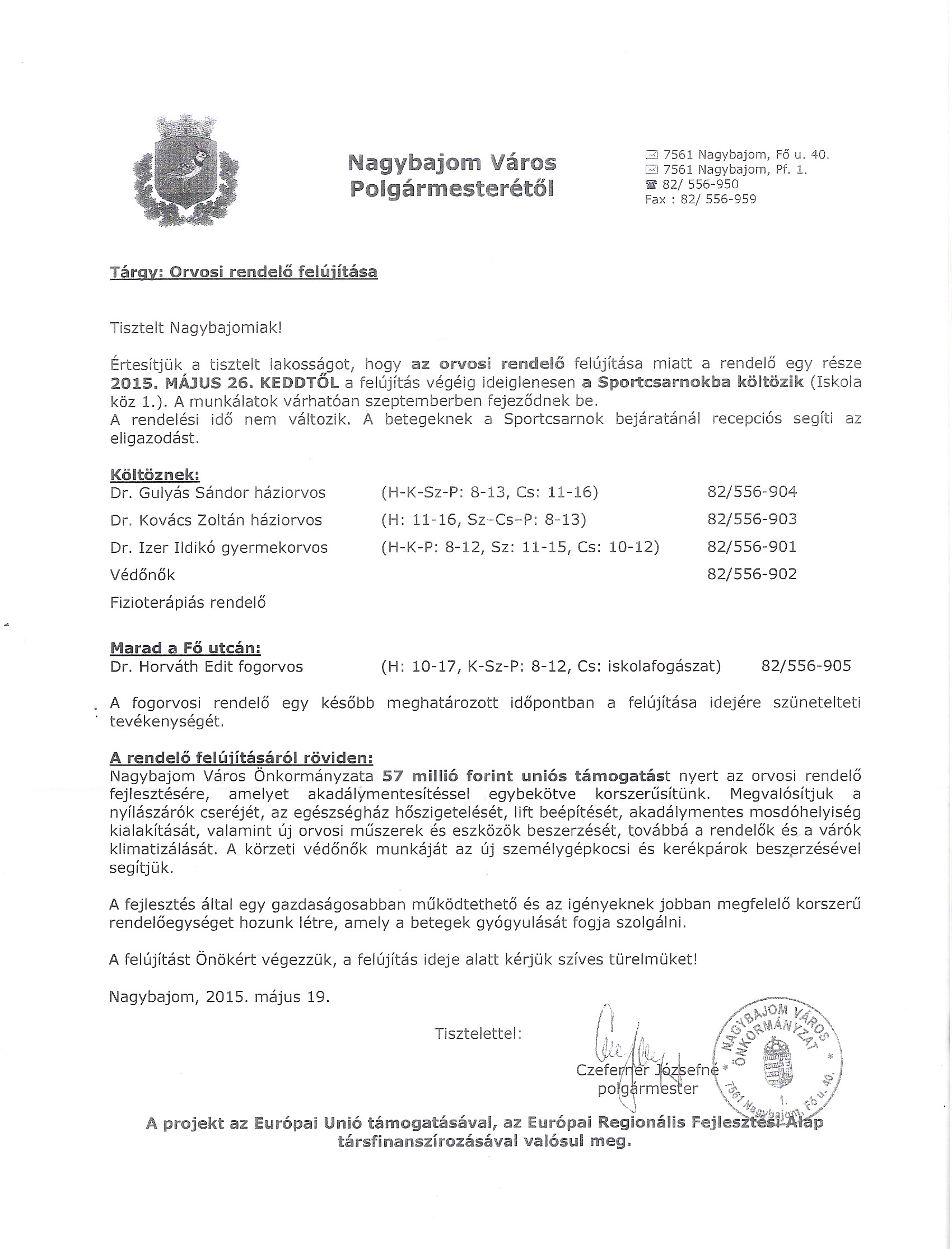 FIGYELEM: A SZÓRÓLAPON FELSOROLT TELEFONSZÁMOKON AZ ELKÖLTÖZTETETT ORVOSOK NEM ÉRHETŐK EL!!!